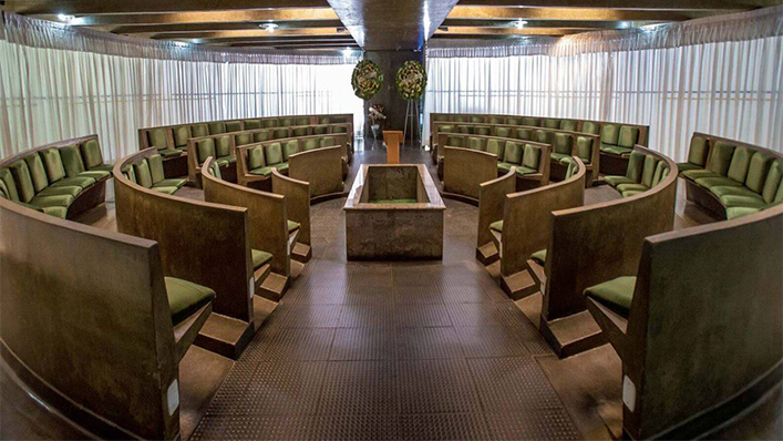 No centro da sala possui uma espécie de elevador, onde fica o caixão. Quando a cerimônia é encerrada, a família precisa se retirar do espaço, para que o caixão seja recolhido para o andar de baixo.